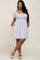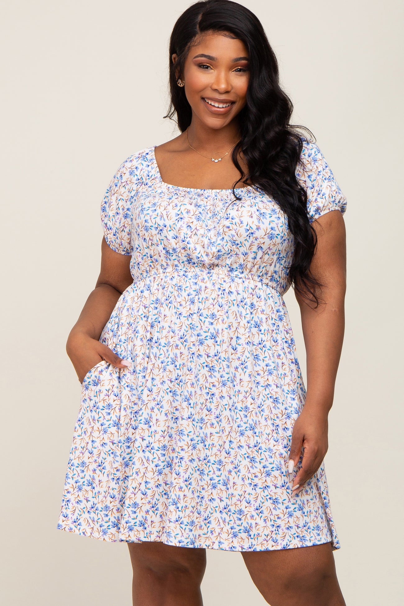 A soft knit, floral print dress featuring a rounded neckline with an elastic band, short puff sleeves, side pockets and an empire waist.