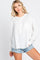 A lightweight top with front functioning buttons, a rounded raw neckline, a front pocket, long drop shoulder sleeves, and a curved raw hem. Waffle knit contrast on the front button plague and along the sides.