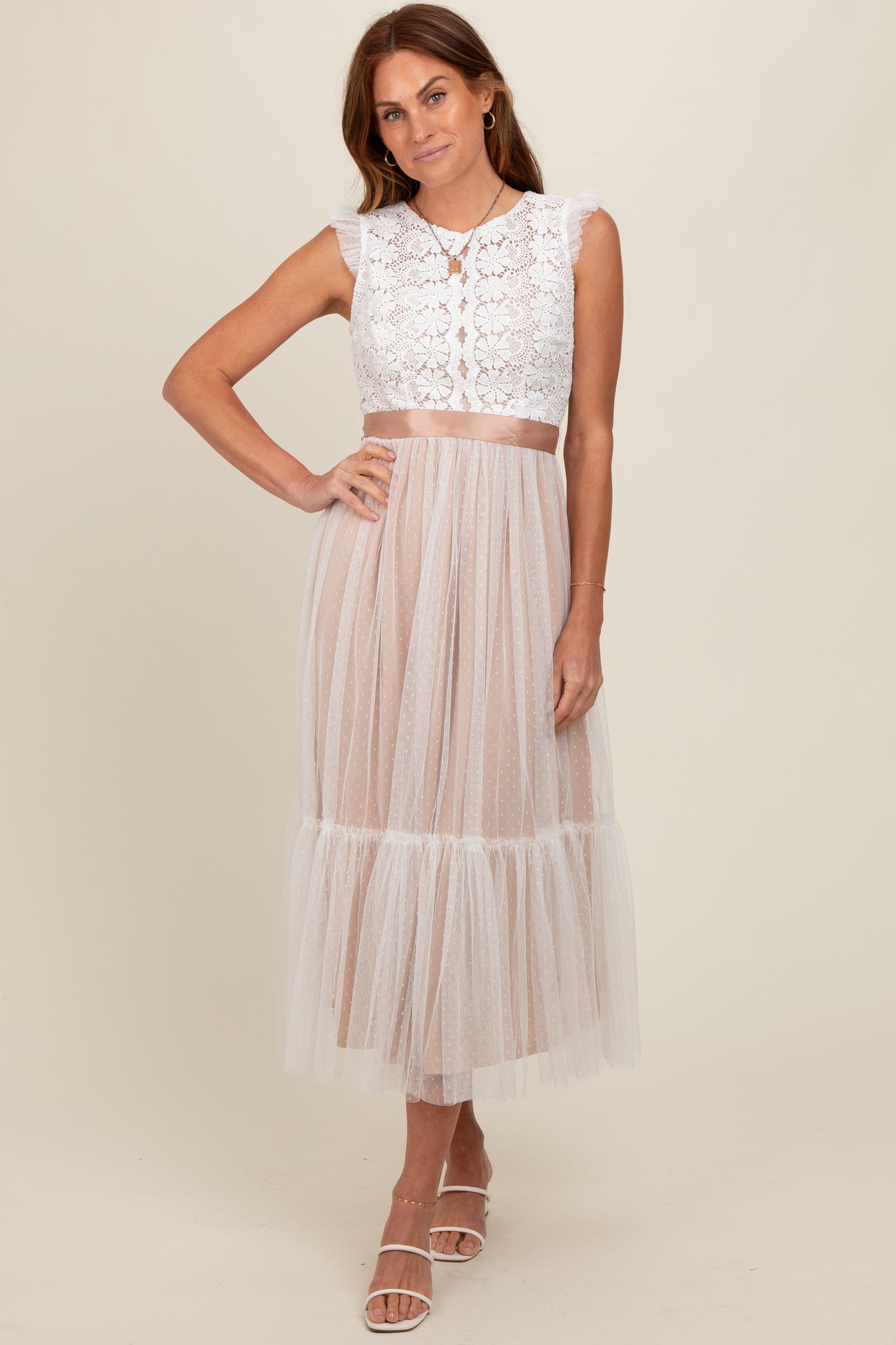 White Lace Contrast Tulle Maternity Maxi Dress