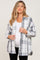 A printed maternity button up top with a collar, a slight hi-low rounded hem line, cuffed long sleeves, and two front pockets.
