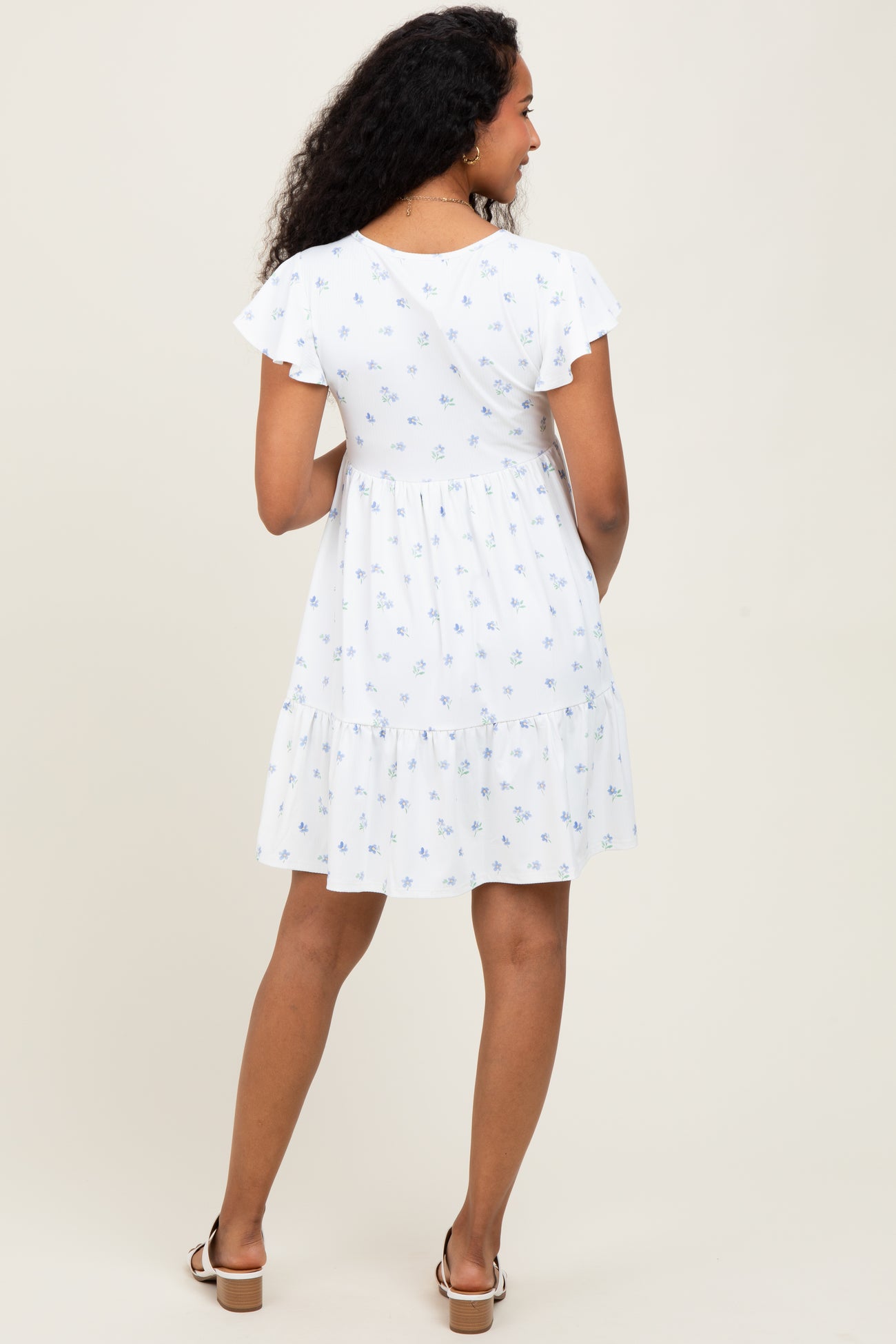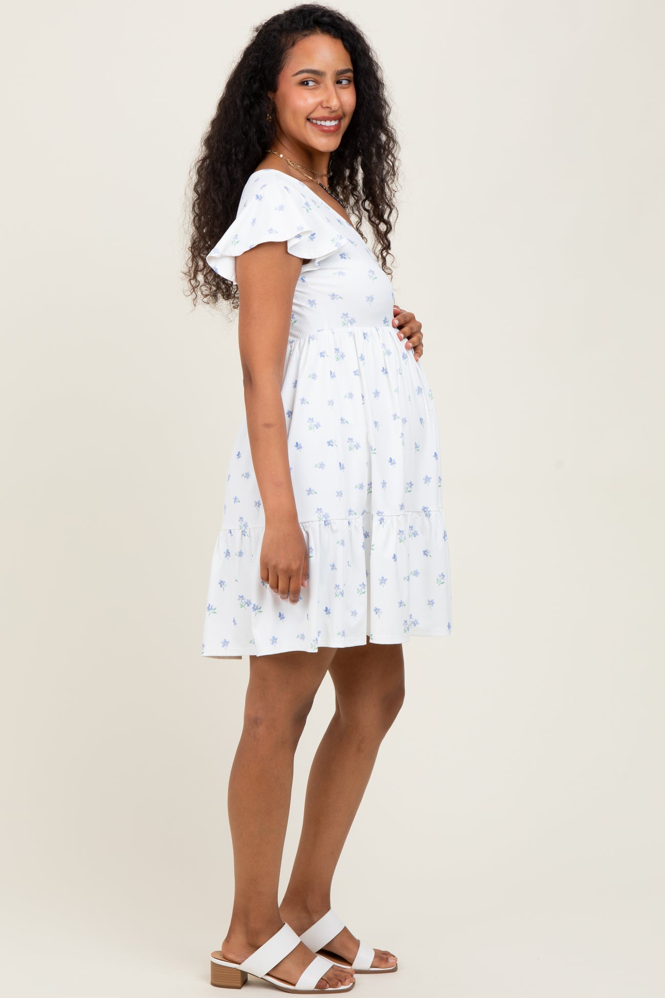 White Ruffle Sleeve Tiered Floral Knit Rib Maternity Mini Dress