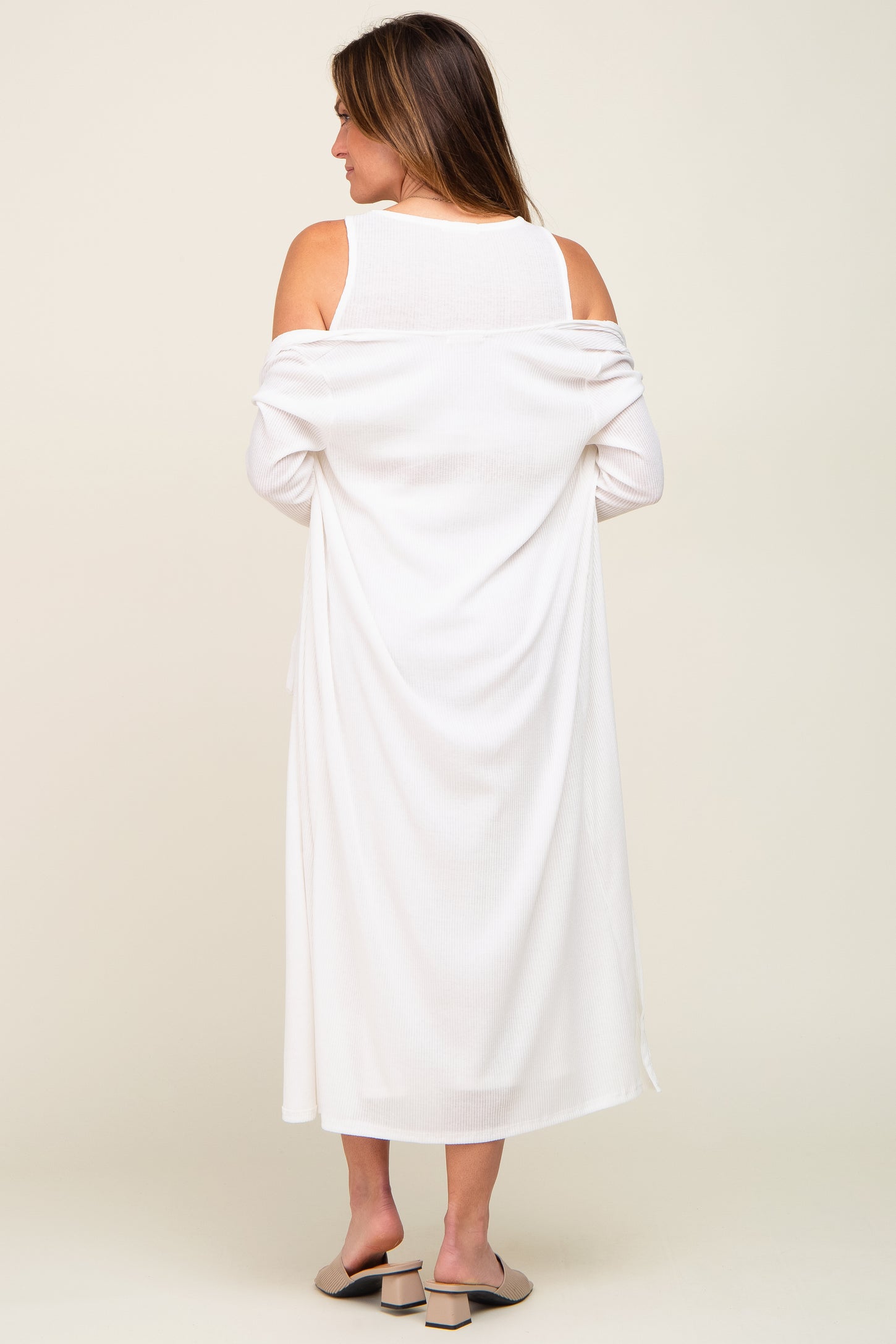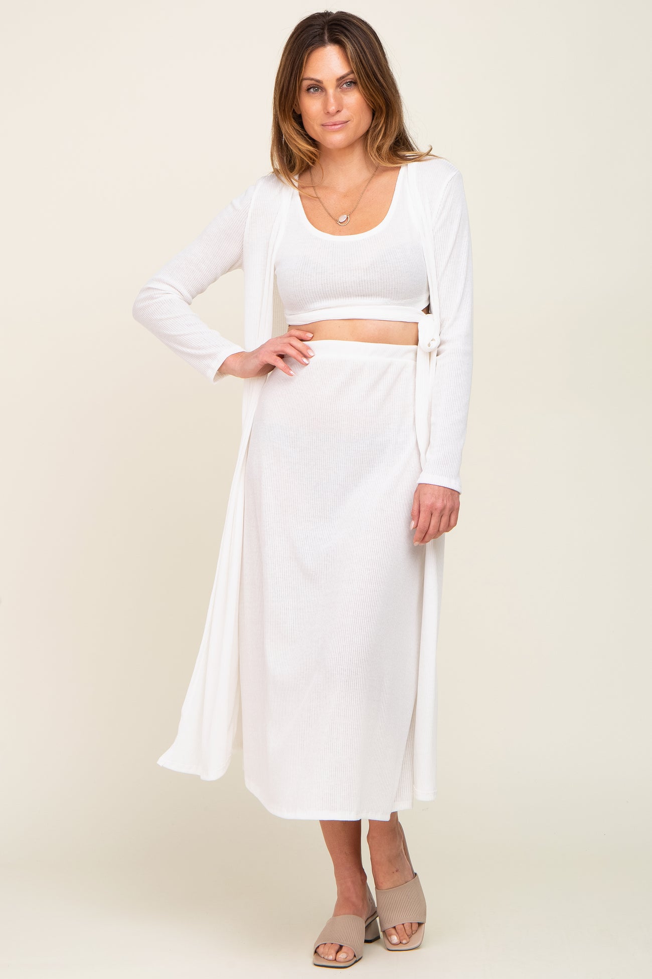 A 3-piece set featuring a crop top, fitted skirt, and cardigan.