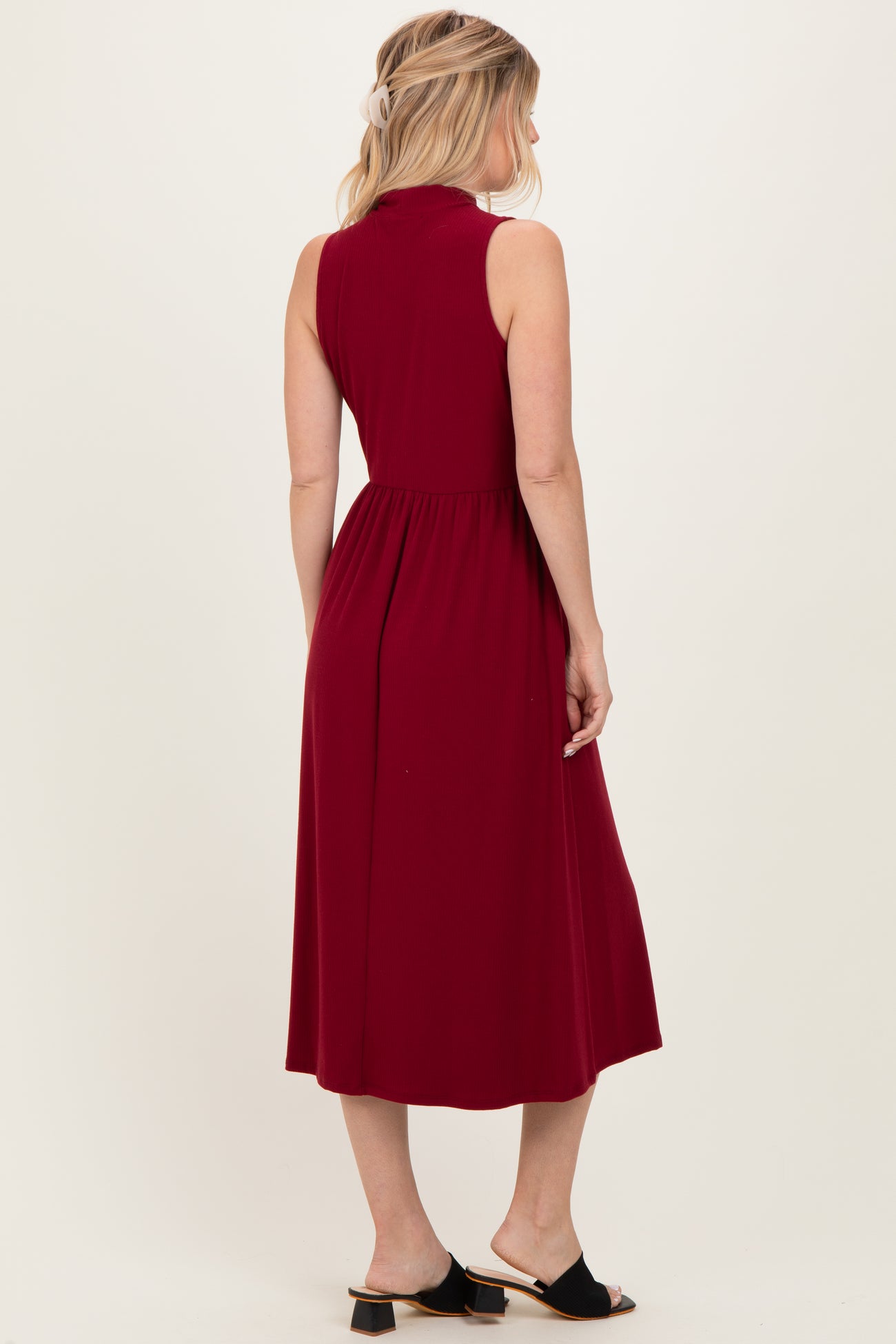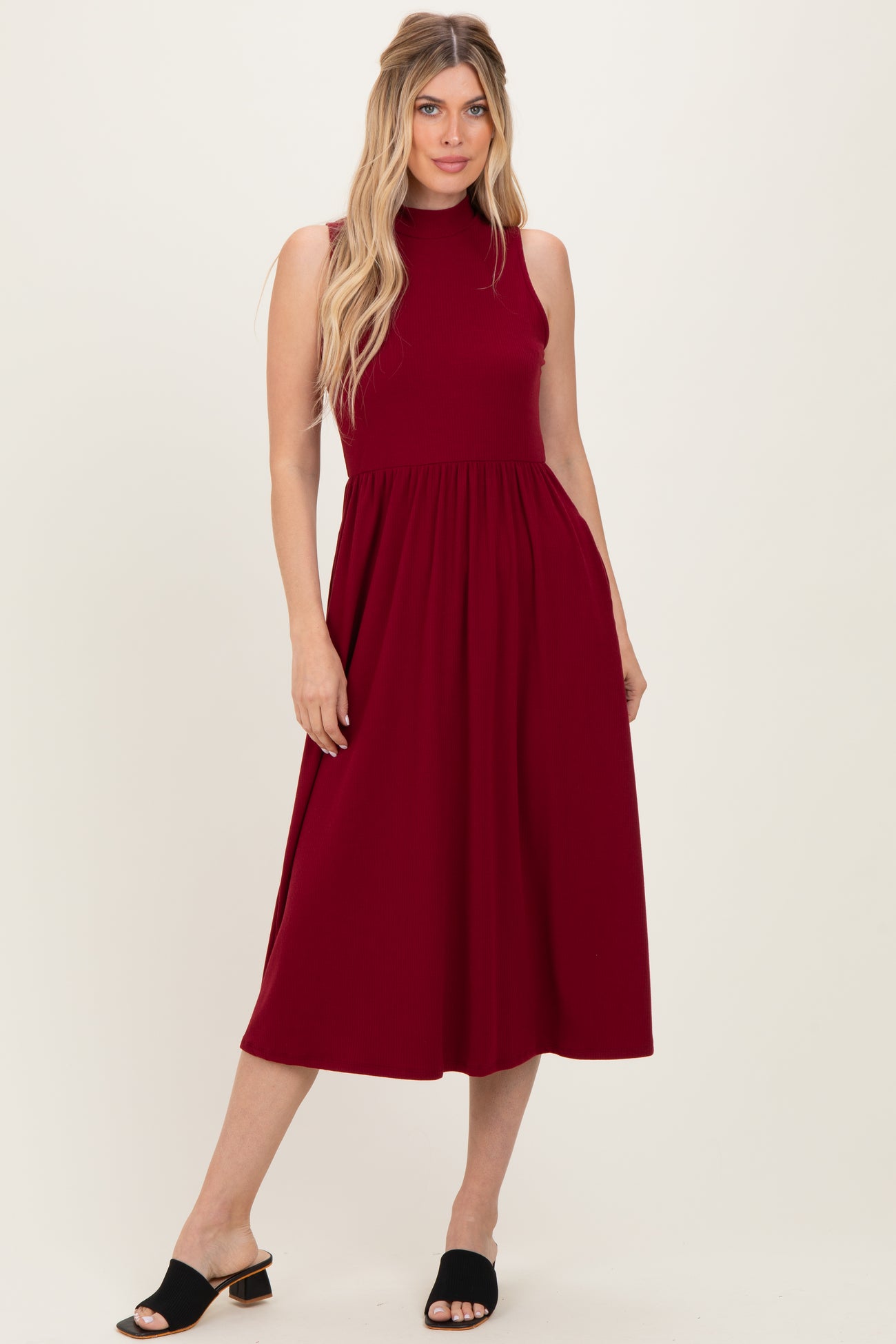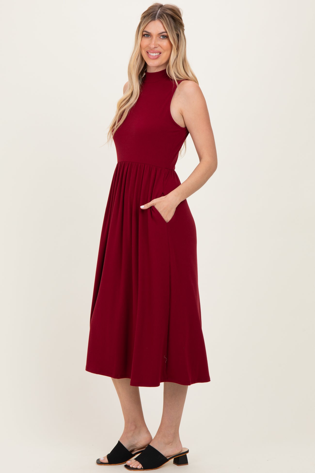 Wine Ribbed Mock Neck Sleeveless Midi Dress