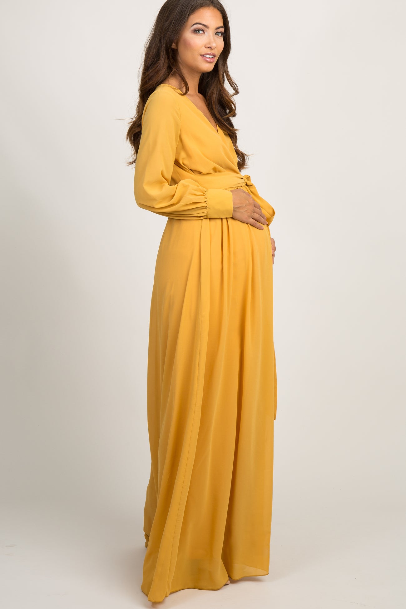 Yellow Chiffon Long Sleeve Pleated Maternity Maxi Dress