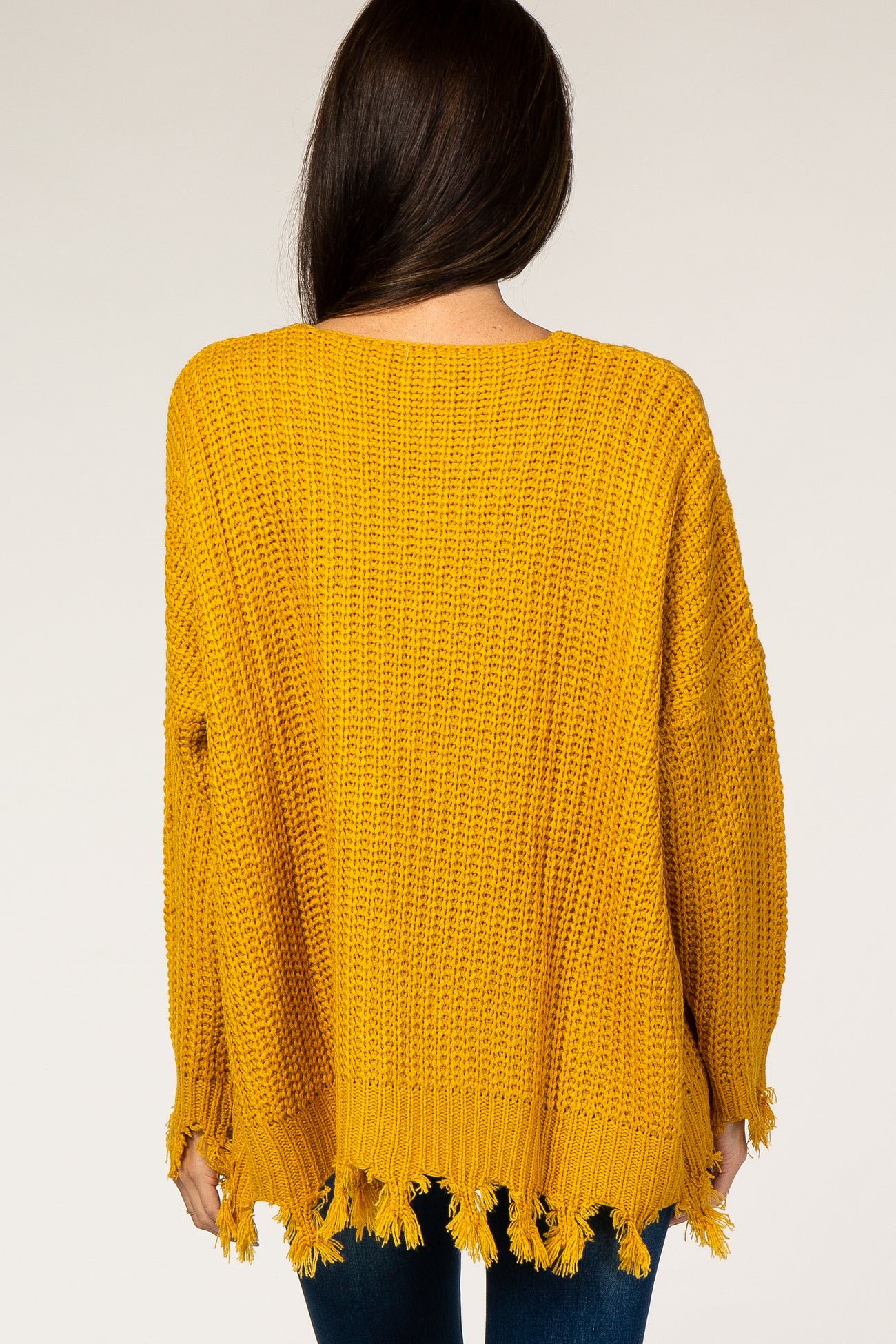 Details A thick knit sweater featuring a rounded v-neckline, long sleeve and distressed fringe detailing at the hem. Content + Care
