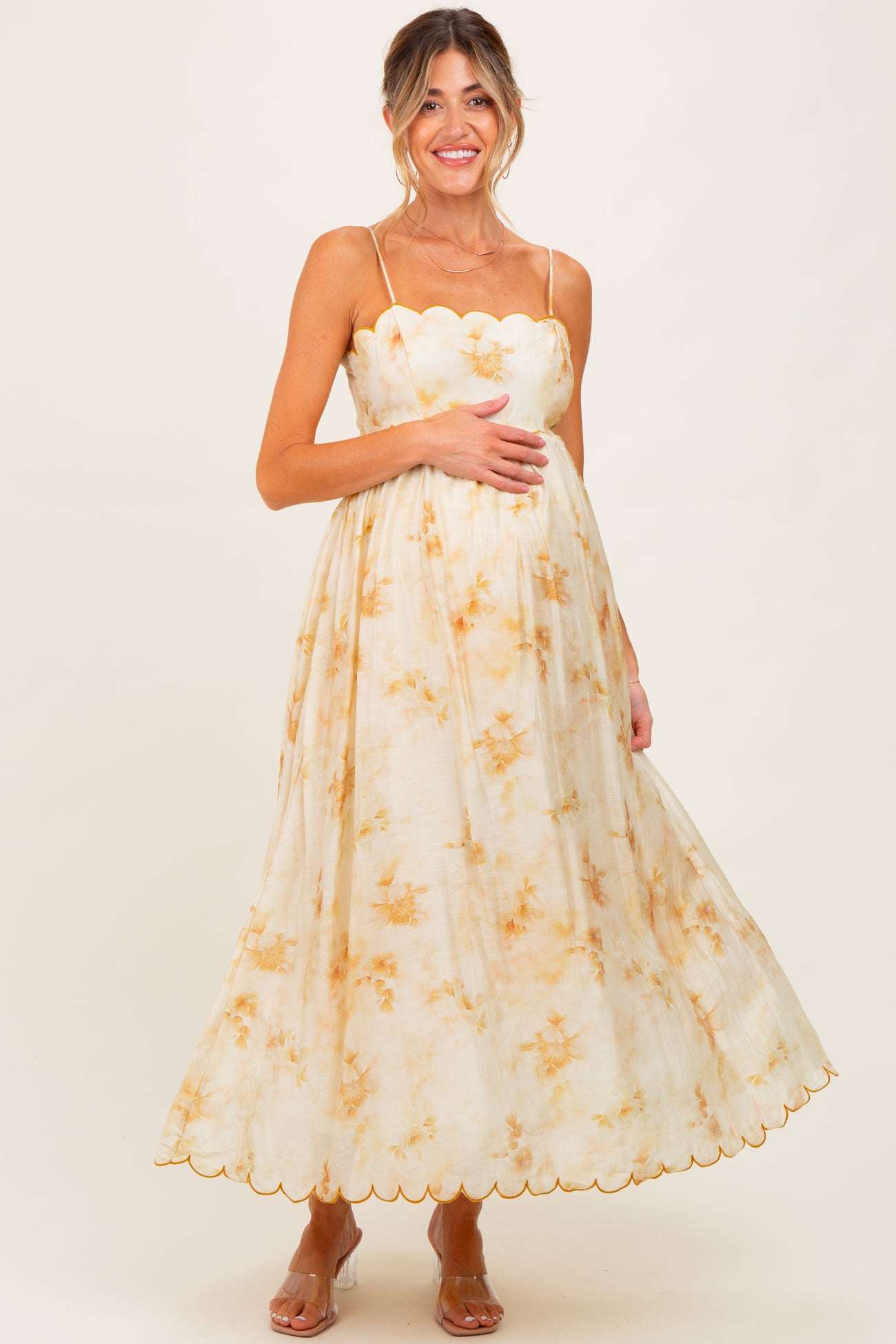 Embrace effortless elegance with our Yellow Faded Floral Scallop Edge Cutout Maternity Midi Dress. This dreamy dress features delicate spaghetti straps and a scalloped neckline, adding a whimsical touch to your maternity wardrobe. The soft, faded floral pattern in warm yellow hues creates a gentle, feminine look, perfect for sunny days and special occasions. The flattering cutout detail offers subtle breathability and style, while the flowing midi skirt accommodates your growing bump with ease. Lightweight and breathable, this dress ensures comfort without sacrificing chic. Step into spring and summer with confidence and grace!