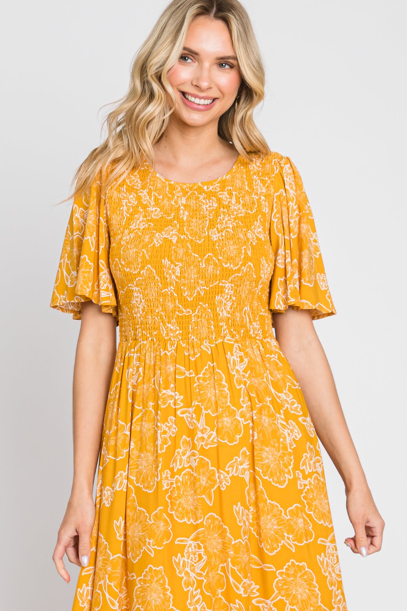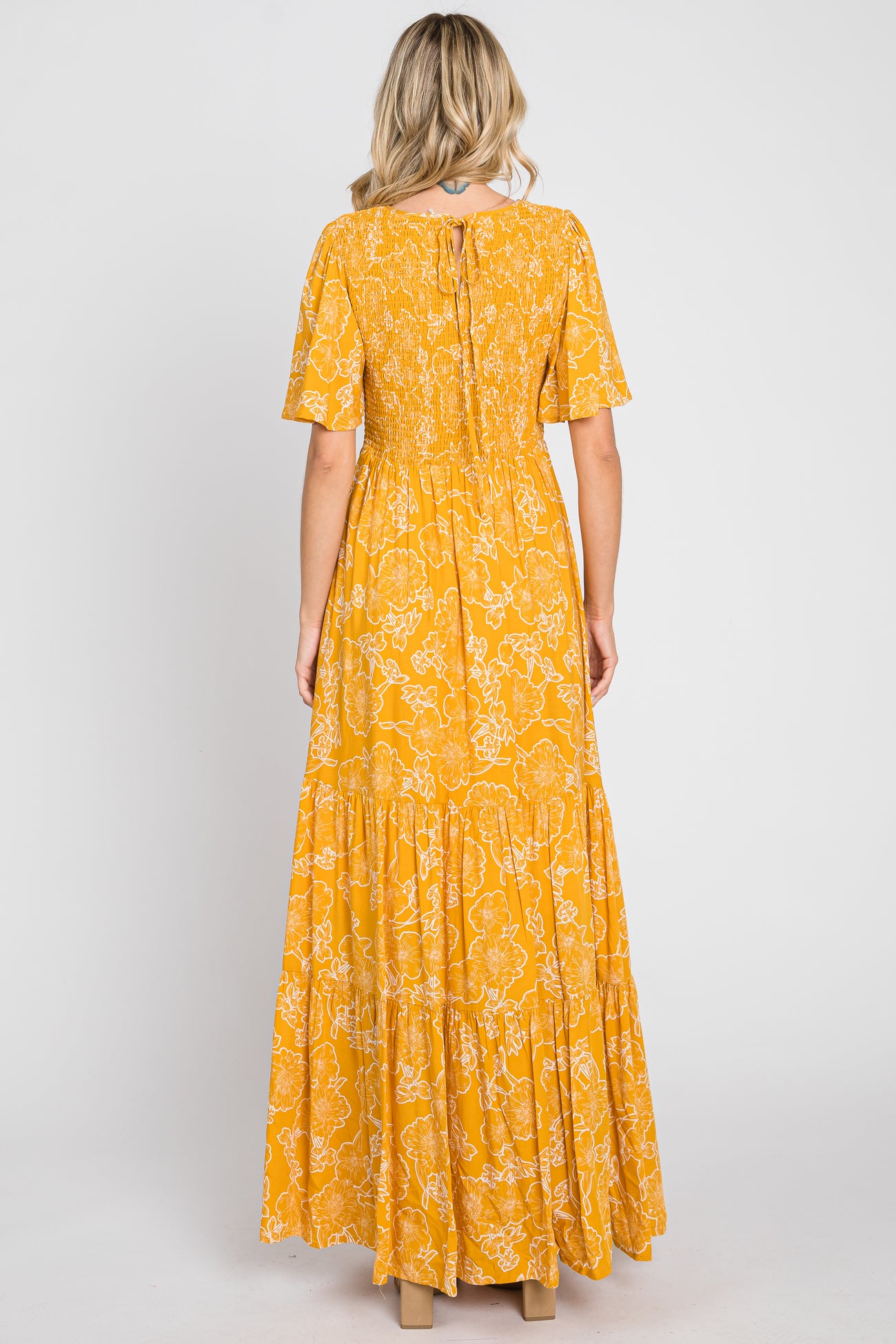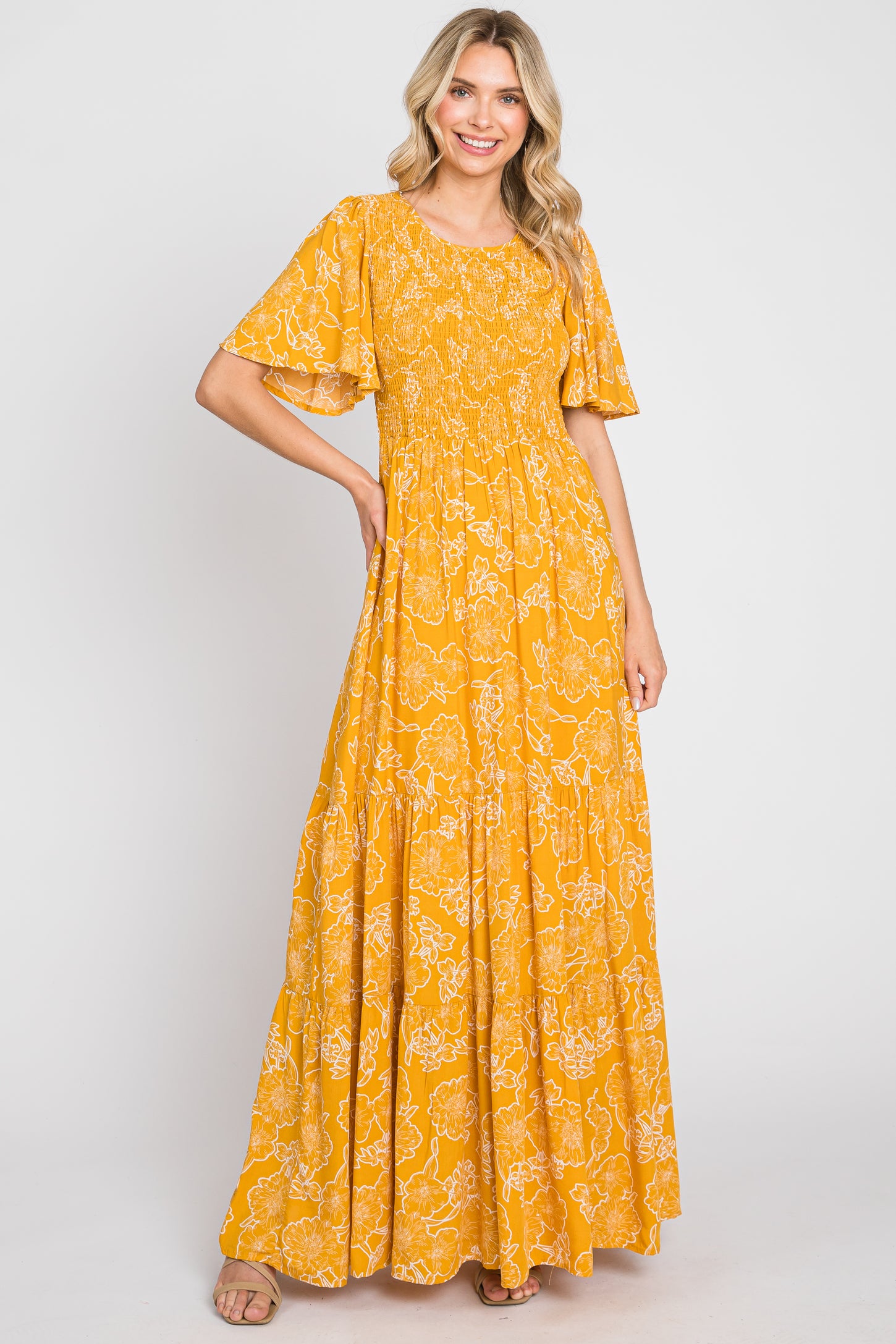 A floral maxi that features short flounce sleeves, a rounded neckline, a smocked bodice, a tiered skirt, and a back tie. Dress is partially lined.