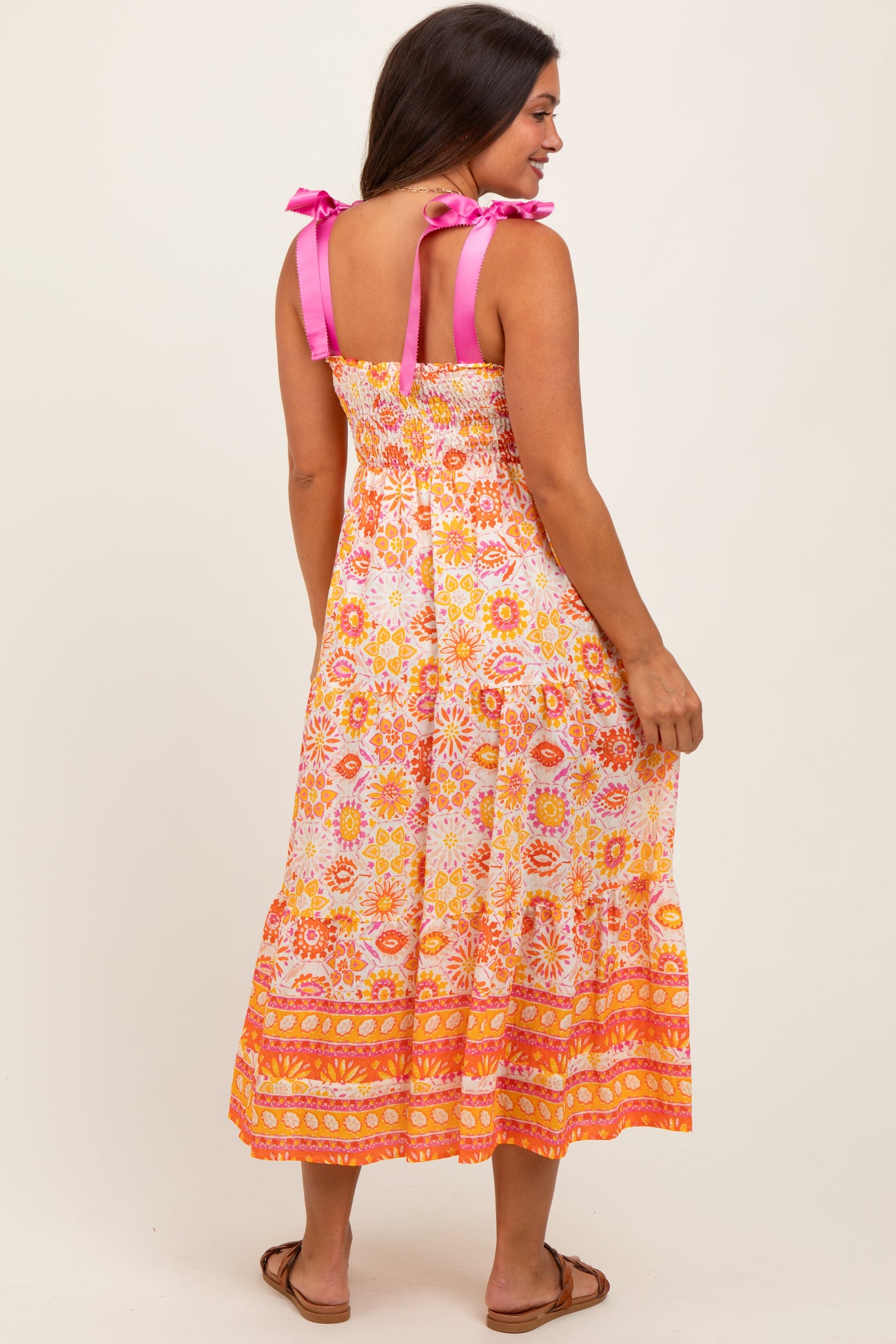 Yellow Floral Shoulder Tie Smocked Maternity Midi Dress