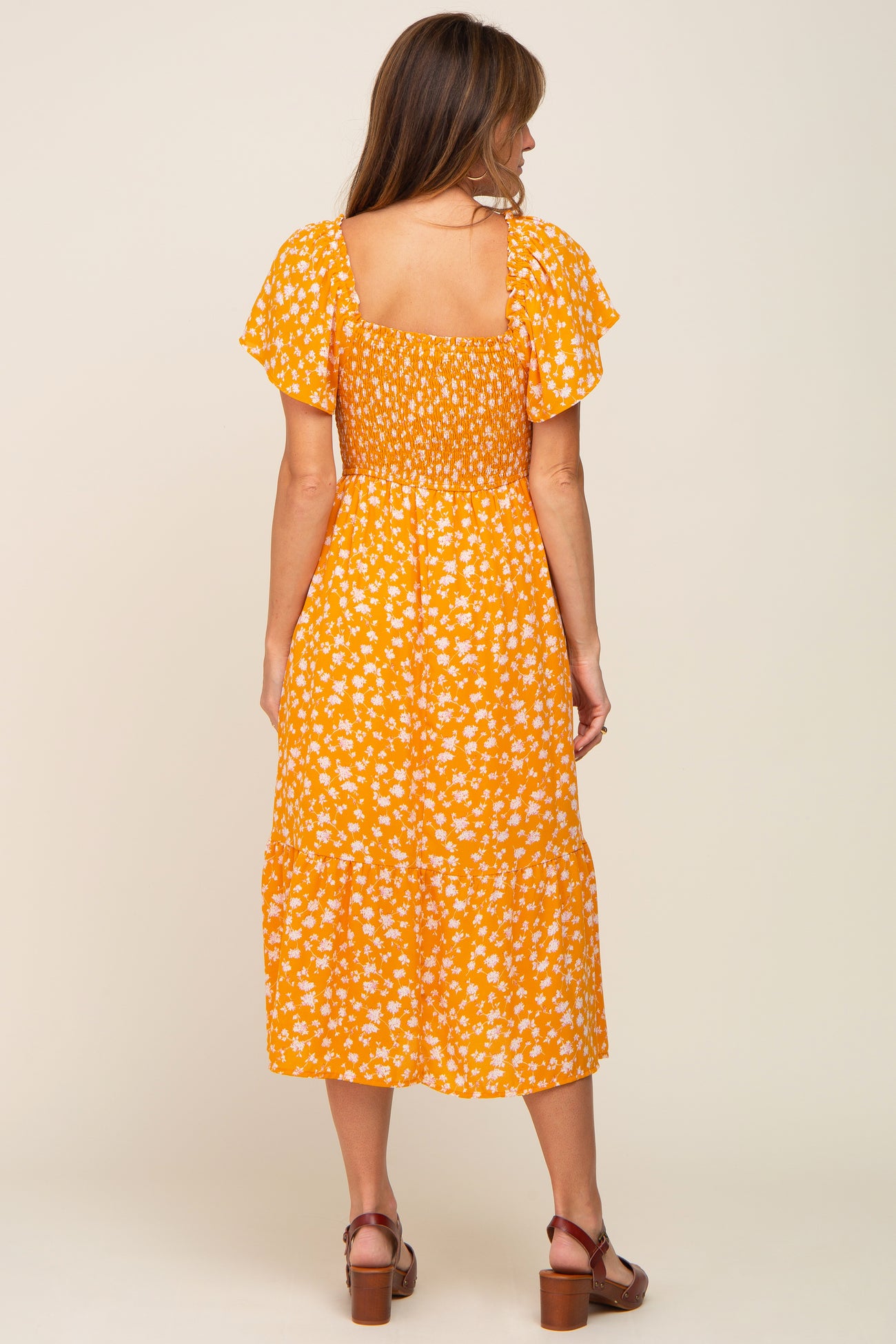 Yellow Floral Smocked Midi Dress