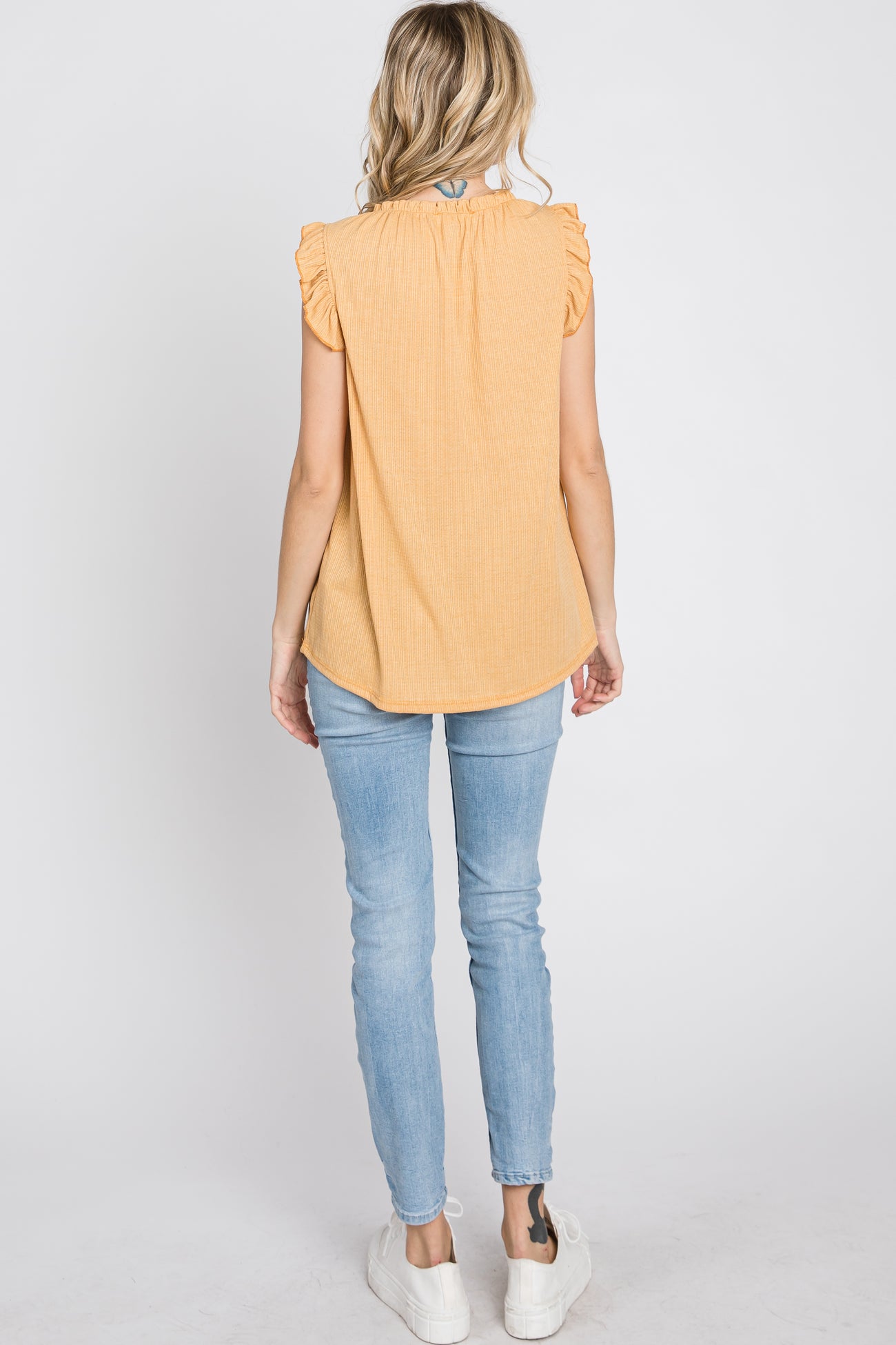 Details A solid tank top with ruffle accents at the sleeve openings and the neckline. Content + Care