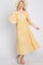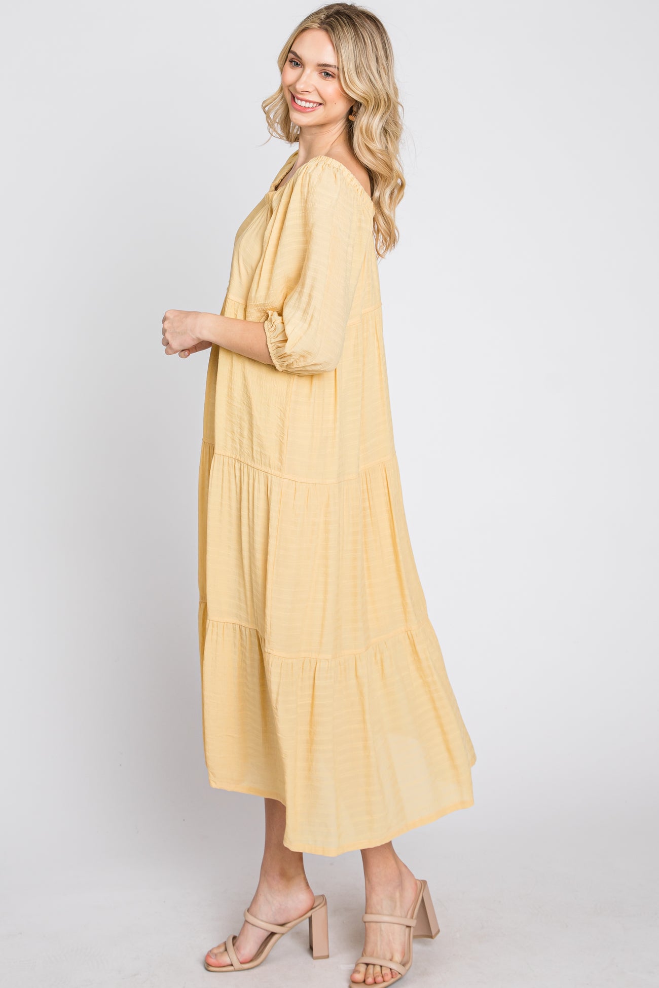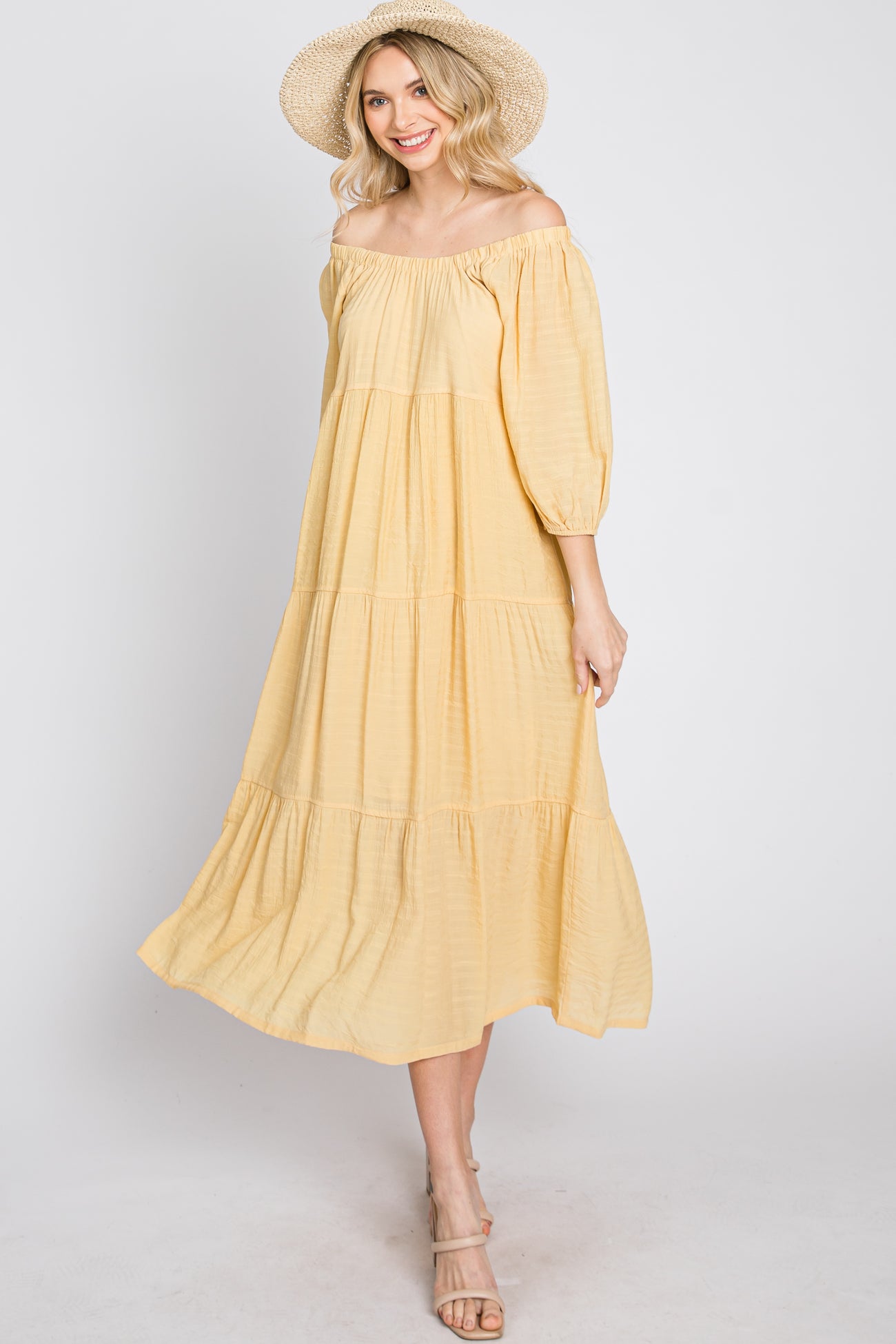 A midi dress featuring a rounded neckline with an elastic band, 3/4 length puff sleeves and pleated tiers.